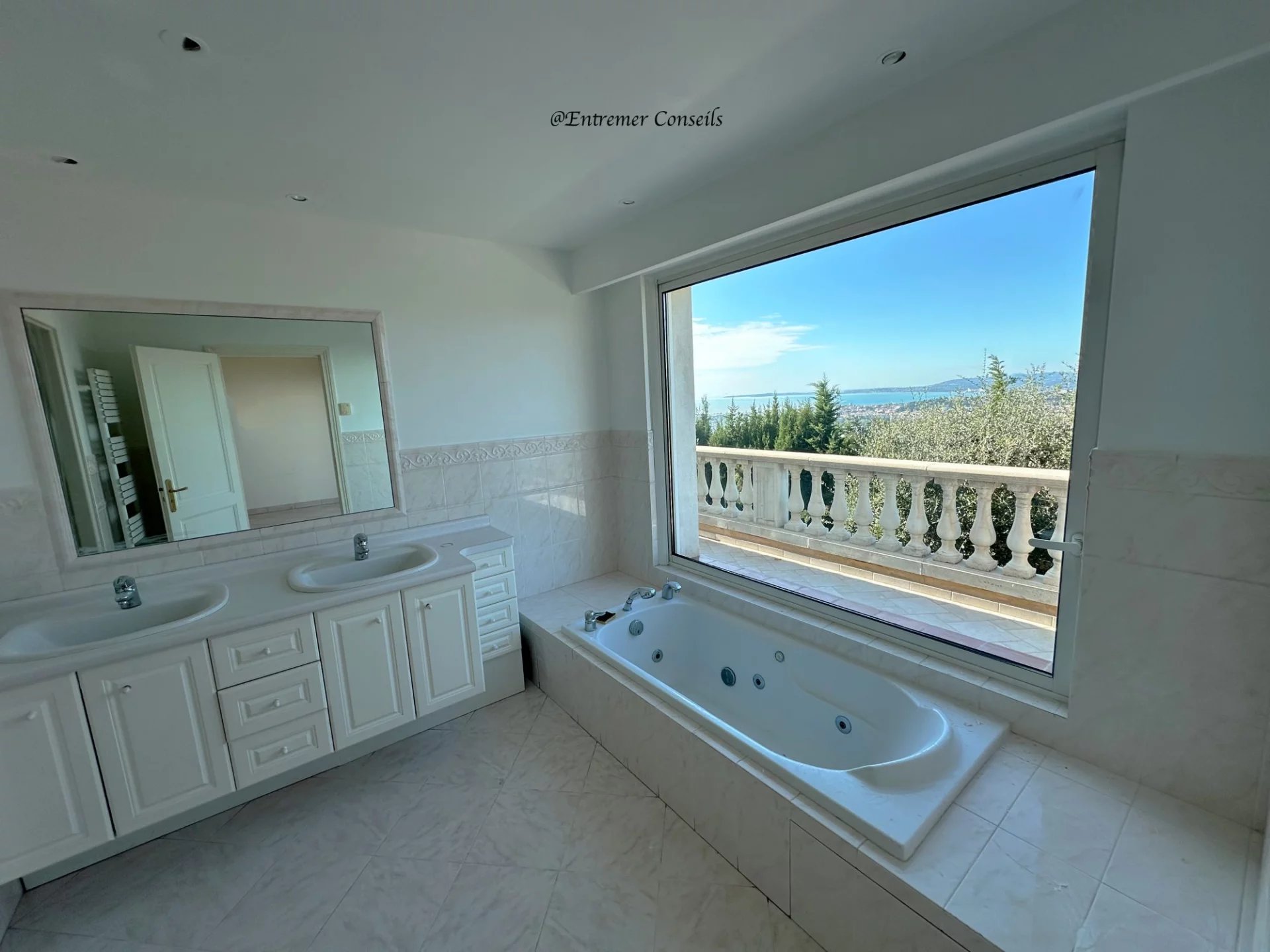 La villa est composée d’un grand garage avec local technique, d’une entrée prestigieuse sous colonnes, d’un grand séjour et salle à manger s’ouvrant avec des baies vitrées à galandage sur l’immense terrasse qui surplombe la Méditerranée. Une cuisine aménagée et toute équipée a elle aussi une grande baie vitrée à galandage ouverte sur la piscine et la mer au fond. Sur l’arrière de la cuisine, nous retrouvons une buanderie qui fait aussi office de cellier et sur sa gauche un bureau qui donne vers l’Est.
