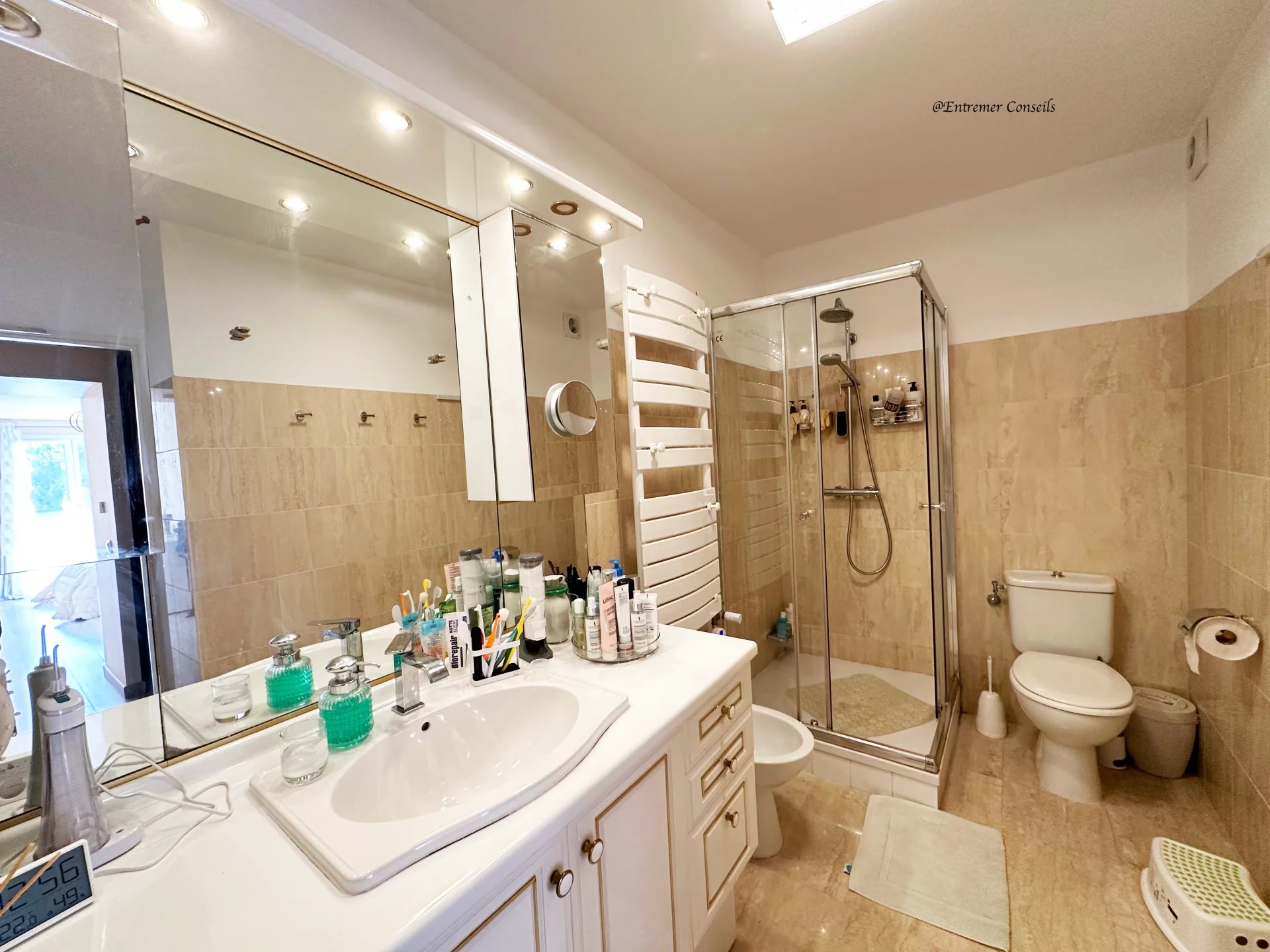 Au premier étage, nous avons trois grandes chambres dont deux suites parentales avec leur accès sur une terrasse avec une véranda et un grand solarium ayant une pleine vue sur la ville et la mer.